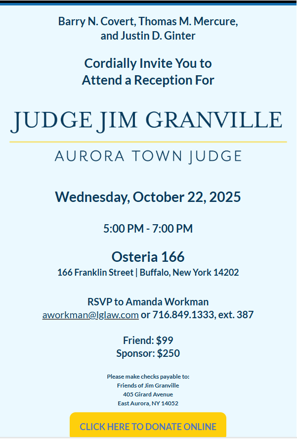 Join us to Support Judge Jim Granville for Re-election When? Wednesday October 22nd 5:00PM-7:00PM Where? Osteria 166 166 Franklin St Buffalo NY 14202 Cost? $99 Per Ticket Sponsorship? $250 Sponsor Please Make Checks Payable to: Friends of Jim Granville 405 Girard Ave East Aurora NY 14052
