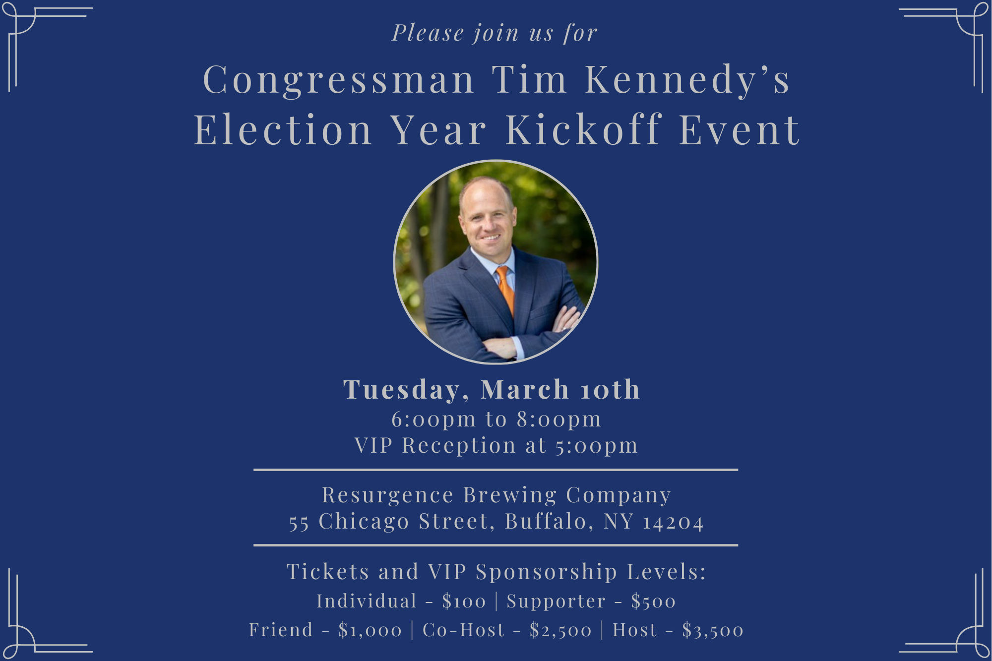 Join Chairman Jeremy Zellner and Special Guests for the Annual Chairman's Circle Luncheon When? Monday, March 2nd 11:30AM -1:30PM Where? Jazzboline Restaurant & Bar 5010 Main St, Amherst, NY 14226 Cost? Chairmens Circle $5000 Chairmen's Council $2000 Please Make Checks Payable to Erie County Democratic Committee 671 Seneca St. Buffalo NY 14210